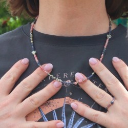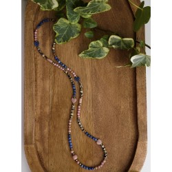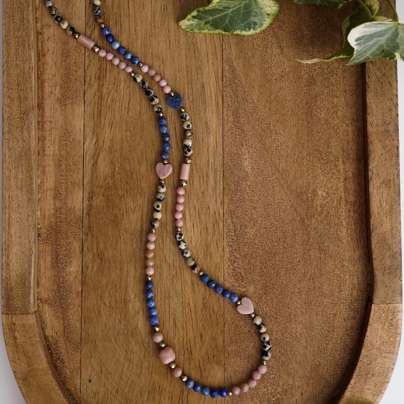 Wyjątkowa kompozycja trzech naturalnych kamieni tworzy naszyjnik pełen koloru i energii. Delikatny róż rodonitu harmonijnie łączy się z głębokim błękitem sodalitu i nakrapianym jaspisu dalmatyńskiego, tworząc zjawiskową kolorystyczną symfonię. Elementy metalowe wykonane ze stali szlachetnej gwarantują trwałość i są bezpieczne dla alergików.
